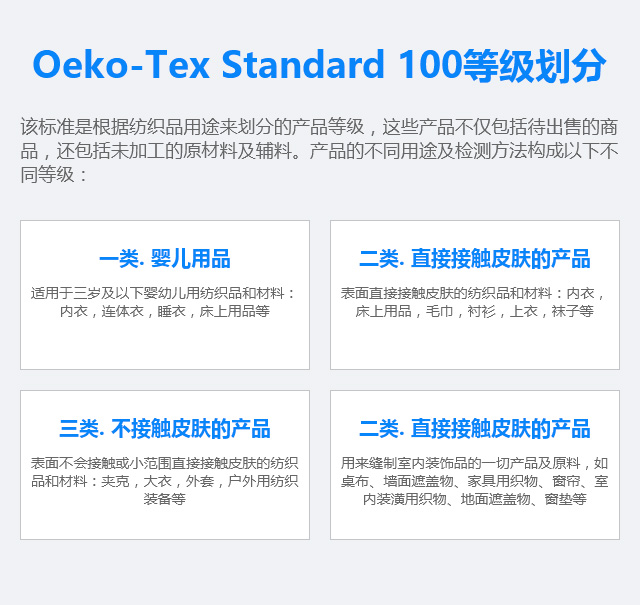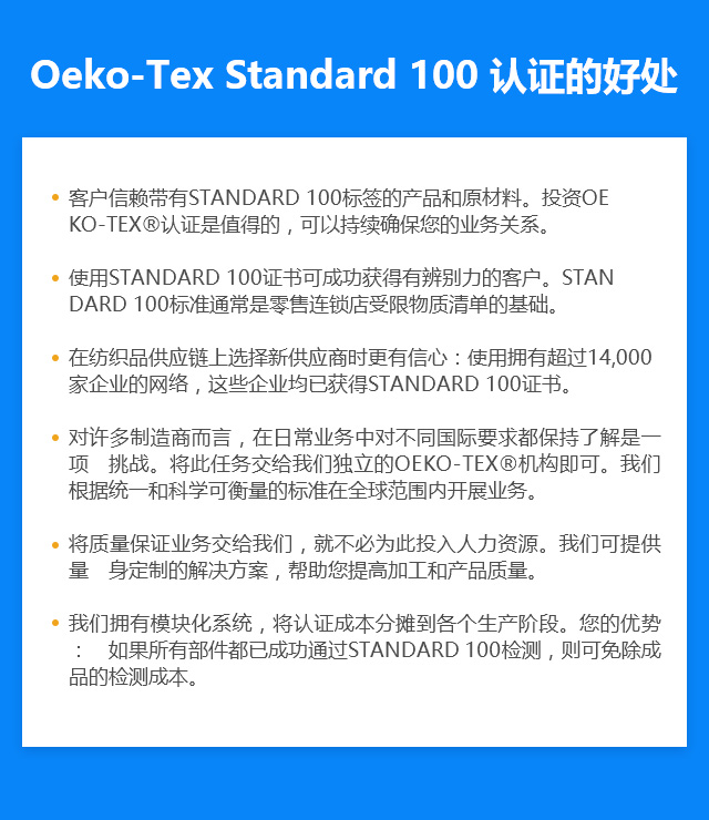 OEKO-TEX Standard100是生态纺织品安全环保认证,即通过检测纺织品以及辅料是否含有OEKO-TEX限制的有害物质,人类穿着是否危害或者可能危害到人体的健康,它不是代表产品质量的质量标签,而是信心纺织品的安全标签。有害物质清单以及限量值都可以在OEKO-TEX官网查询,包括已通过认证的企业同样可以在系统检索。