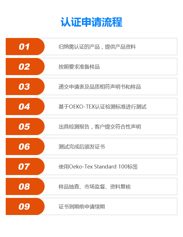所有与纺织品的生产和销售有关的生产商、经销商都可以就产品来申请Oeko-Tex Standard 100认证。包括纤维、纱线、坯布、辅料、服装以及从事染整加工和其它与纺织品有关的生产商、经销商。认证申请需要向国际环保纺织协会的成员机构提出。